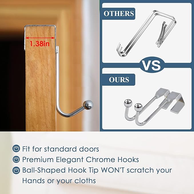 - 2 Wide Metal Hooks & Adhesive- The 1.38β wide over-door hooks are specially designed with BALL-SHAPED HOOK TIPS to avoid scratching clothes or fingers. Premium THICKNESS & WIDTH ensure the hooks hang stably on the door. They never deform, slide out of place, or scratch your door easily like those cheaper hooks. Two damage-free adhesives are included for your use.