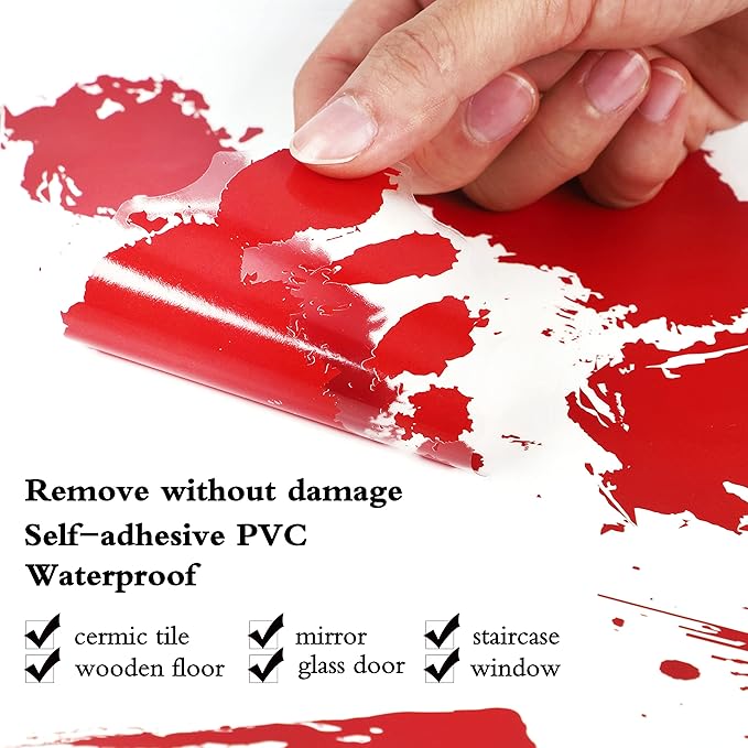 - Measurement - Footprints Size:7" x 3.2". Bloodstain Size:among 1.4”to 5.6”.Shoes Print Size:8" x 3.8".Zombie Hands Size: 5" x 3.5".Small Handprint Size:5" x 3.5".Big handprint Size:5" x 6.9".Restroom Sign Size:9.3" x 6.6".
