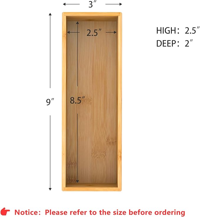 - 【Multi-functional Storage Box】 This deep bamboo organizer boxes are good for organizing items, such as forks, spoons, and knives in kitchen; brushes, soap dispenser and toilet paper in bathroom; cosmetics, makeup tools and hair accessories in makeup room; documents, pens and paper clips in office. Try this bamboo storage box organizer - ending clutter in your office desk and kitchen drawer.