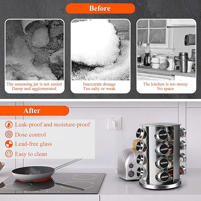- 【Safe & Durable Material】Our rotating revolving spice rack is made of high quality stainless steel, strong and durable. The glass jar is made of lead-free glass, which is safe and secure to store the spices, and the transparent jar body is convenient for observing the spices.