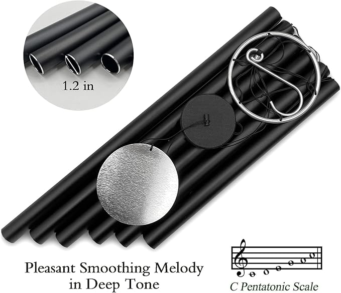 - Black Wind Chimes Large -The beautiful tones of wind chimes in the garden wash away the city noise and fill the air with gentle music. This chimes are as beautiful to look at as the sound is gorgeous and will add many years of relaxing sounds to your yard.Surround yourself with the music of Life,bring true peace to the soul