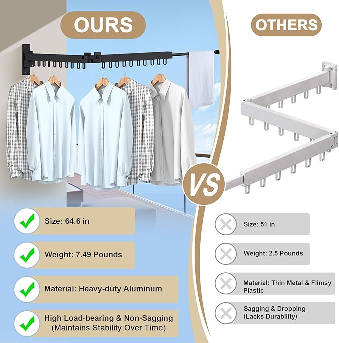 - 【Versatile Use】This laundry hanger dryer rack wall mount isn't just for clothes and towels, it also support heavy quilts and sheets thanks to it high loading capacity. Perfect for indoor or outdoor use, including laundry rooms, patios, and balconies, offering flexibility for various spaces. Plus, save on gas bills by air drying clothes.