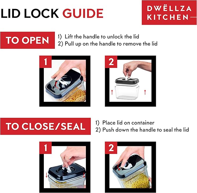 - Enjoy Your Meal With Fresh Food: Keep your food fresh with our easy-to-use airtight lid-lock mechanism. Our food storage containers create an airtight seal by simply pushing down the ring on the lid. Lift the ring and pull it to open the canisters. The airtight seal is tight enough to secure that you can even store liquids without ever worrying about leaking!