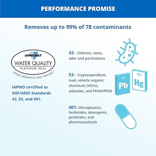 - Clean & Healthy Water Filtration - Carbon filter removes up to 99% of 77 contaminants including lead, PFAS (specifically PFOA and PFOS), mercury, asbestos, herbicides, pesticides, pharmaceuticals, and more!