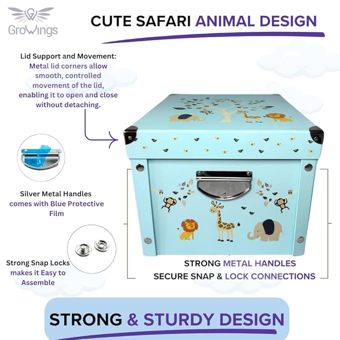 - Premium Quality: GroWings baby keepsake box is easy to assemble, has a safari animal design and complements your baby’s room. Our memory box has strong metal handles and a fitting lid to keep your memories secure.