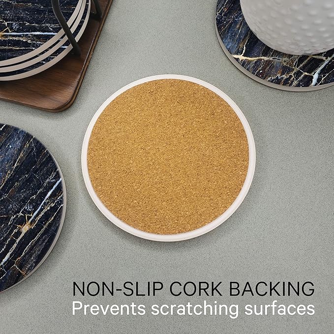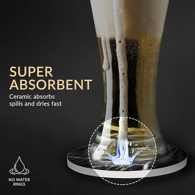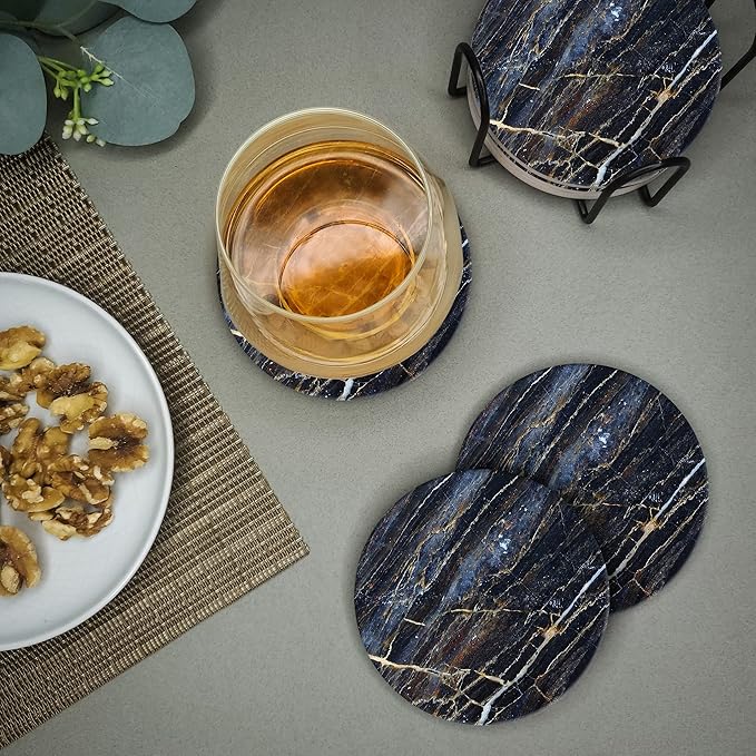 Emerson Coasters for Drinks Absorbent – Natural Stone Drink Coasters Set with Holder, Coasters for Coffee Table, Wooden Tabletop Protection Marble Style – 100% Heavy Duty Set of 6 (Thunder)