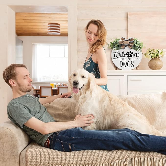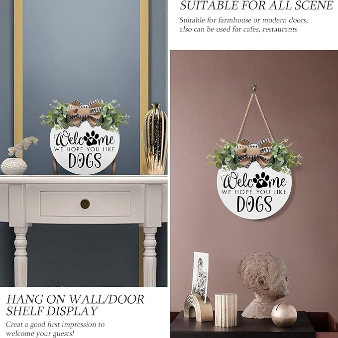 - CUTE DESIGN: Designed with unique, funny word “ Wecome we hope you like dogs" with cute paw print, the welcome wreaths for front door will be a friendly and hospitable way to remind your guest you have dogs and show the best welcome to your friends! Perfect combination of exquisite buffalo plaid bow and vibrant eucalyptus leaves in the welcome we hope you like dogs sign can ensure a charming looking and add a bold and inviting feeling to any wall or home so each will feel warmth and comfort