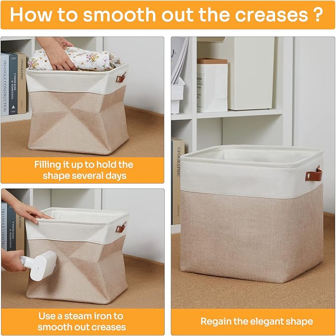 - 【Material】These cube storage bins are constructed of sturdy and attractive linen & EVA with linen interior lining. The sturdy leather handles make it easy to carry or pull off and out of shelves.