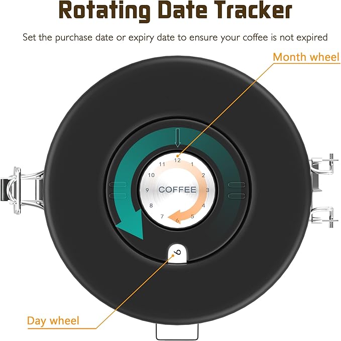 - 【Humanized design】: This coffee storage containers comes with a thoughtful design and an adjustable date tracking wheel above the coffee containers, so you can always check the storage date to know the storage time.