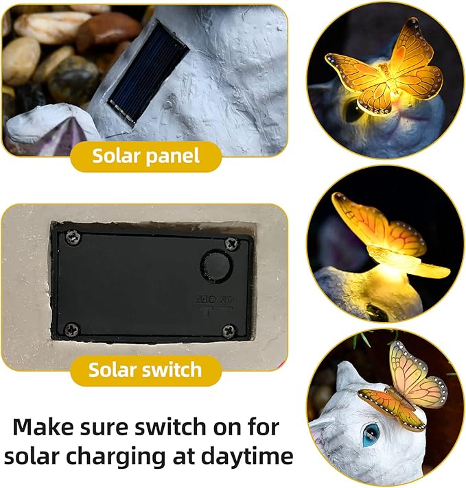 - ▶ Solar Light - Cat garden decor with solar powered, easy to use, can automatically charge the solar energy, light up at night.Energy Efficiency & smart models:with solar-powered, energy saving and energy efficiency.
