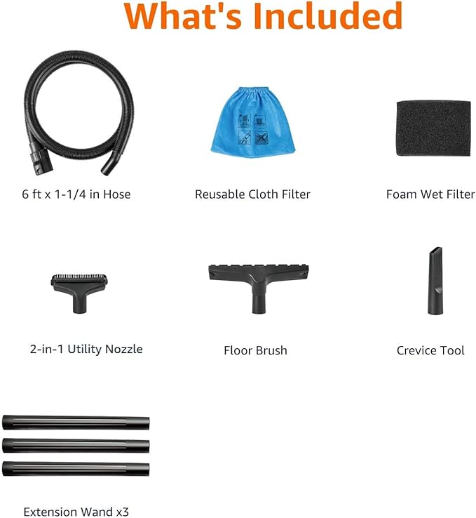 - VERSATILE ACCESSORIES: This wet and dry vacuum cleaner includes a reusable cloth filter, foam wet filter, and locking hose, plus multiple nozzles and extension wands for diverse cleaning tasks