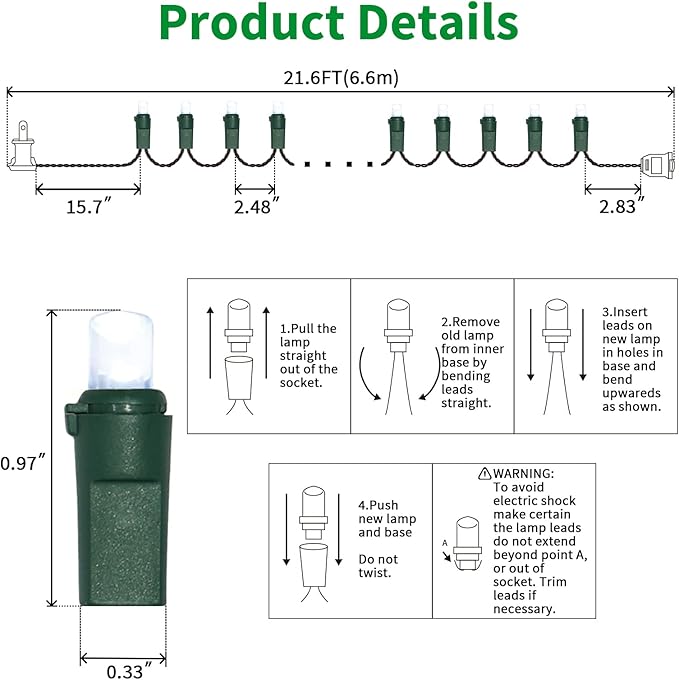 - 5mm LED Christmas Lights: 100 counts warm white 5mm wide angle stable LED string lights spaced 6.3 inches apart with green wire. 7.1 inch leads have a stackable male plug and 5.9 inch tails have a female plug for easy end to end connection.