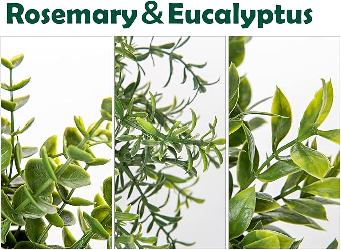 - Material - These 3 fake potted plants with fake plants are made of high quality PE plastic. Roots and branches have clear veins and the natural color gradient catches the eye at first glance.This set of Mini Potted Greenery features eucalyptus, boxwood and rosemary in assorted green tones, potted plant small perfect for creating a comfortable atmosphere you can enjoy for the years to come.