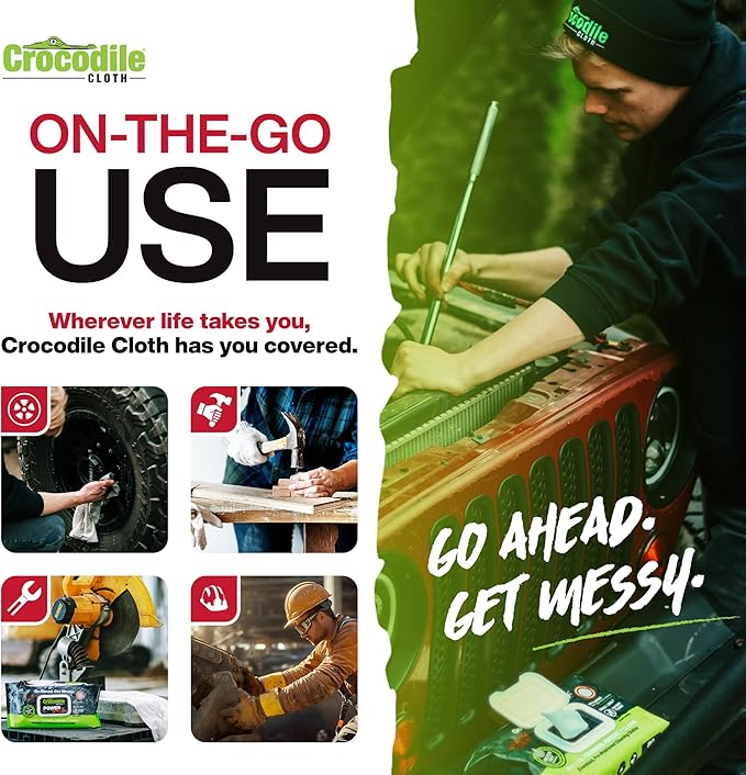 - Hand Safe: Crocodile Cloth wipes are dermatologically tested and infused with aloe and vitamin E to be safe for your hands while eating through grease and oil. Every disposable wipe is formulated to stay wet outside the package for over an hour.