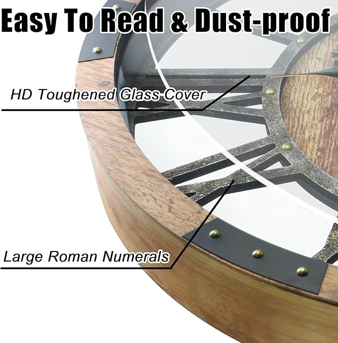- Oversized Clock and Silent Movement: This farmhouse wall clock measures 24" (60CM) in diameter, 2.95'' (7.5CM) in depth, weight-10.12lbs (4.6kg), big size and heavy duty. Using high quality quartz movement material to run smoothly, ensuring accurate timing and absolute silence. Big Roman Numerals, HT toughened glass cover, you can easily read the time from any angle