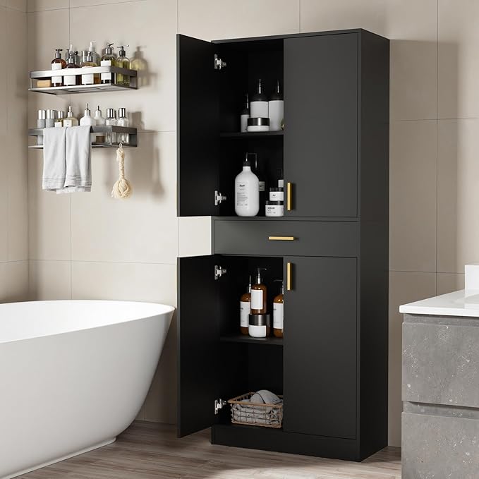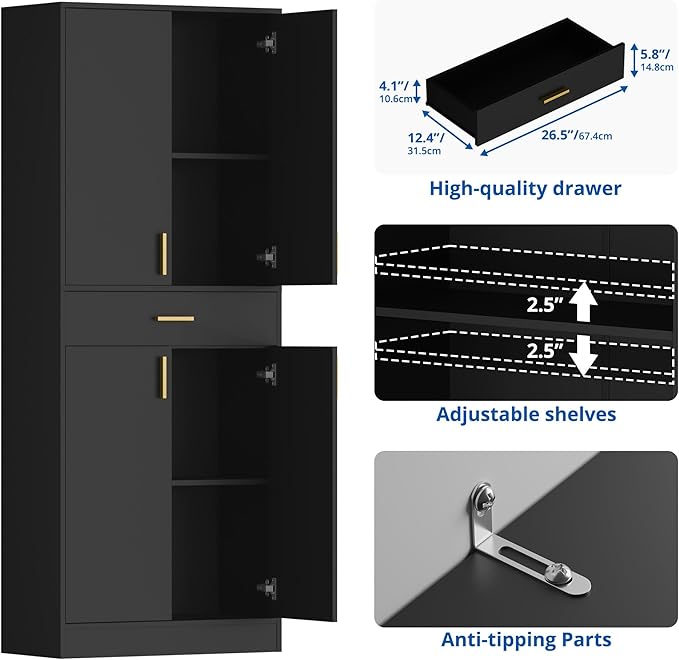 - Multi-Functional Cabinets: 13.4"D x 28"W x 70.8"H, this pantry cabinet includes 2 adjustable shelves and a large sliding drawer to meet your storage needs; In addition to organizing kitchen essentials, this tall cabinet can easily adapt to storing bathroom necessities or expanding the storage space living room