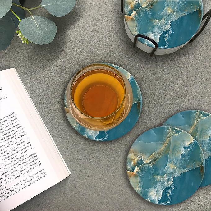 Emerson Coasters for Drinks Absorbent – Natural Stone Drink Coasters Set with Holder, Coasters for Coffee Table, Wooden Tabletop Protection Marble Style – 100% Heavy Duty Set of 6 (Seaside)