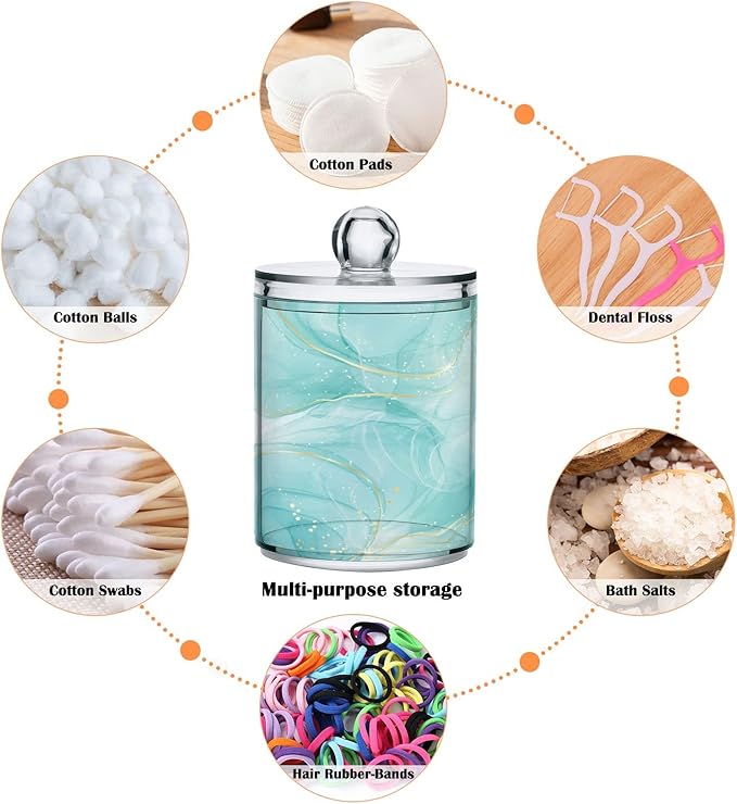 2 Pack Qtip Holder Dispenser Turquoise Marble Bathroom Storage Canister Lid Acrylic Plastic Apothecary Jar Set Vanity Makeup Organizer for Cotton Swabs/Pads/Floss