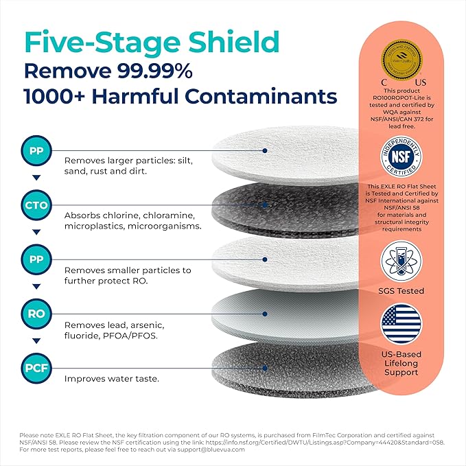 - SPACE-SAVING DESIGN + YEARLY MAINTENANCE: The ROPOT-Lite offers a compact 5-stage filtration system, perfect for 1-2 people, with easy annual filter replacement. Certified by WQA against NSF/ANSI/CAN 372 for lead-free and tested by SGS, it uses a 0.0001μm RO membrane to effectively reduce harmful contaminants, including TDS, PFOA, PFOS, Chlorine, Fluoride, Arsenic, Lead, and more. Enjoy pure, healthy water that fits seamlessly into your living space.