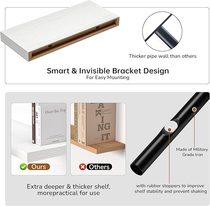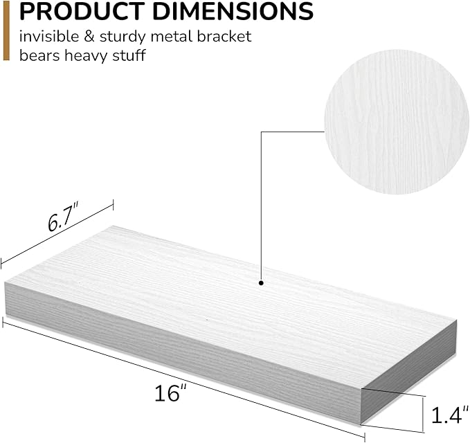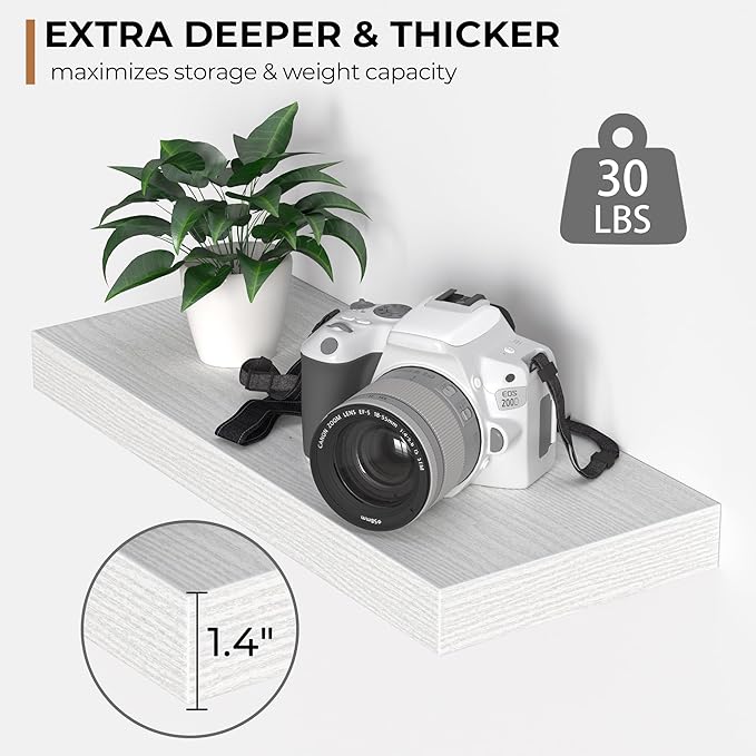 - Extra Deeper & Thicker - Each board measures 16"W x 6.7"D x 1.4"H. Extra deeper and thicker design in order to bring maximizes storage space and weight capacity, even hold up to 30 lb each. This floating shelf taking up zero square feet, reduces clutter and highlights dΓ©cor in compact spaces.