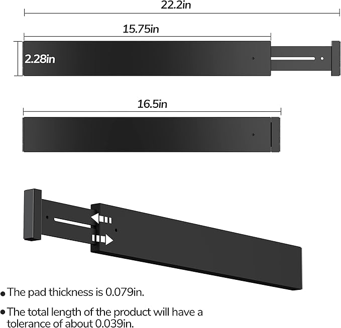 - EXPANDABLE: The size is 16.77 inch (un-expanded) to 22.05 inch (expanded); The pad thickness is 0.079 in, and the total length of the product will have a tolerance of about 0.039 in; Compressed packaging in transit may prevent the spring from being fully stretched to a sufficient length; At this time, please manually pull out the dividers to the top to ensure sufficient length