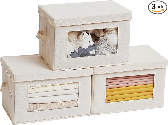 Citylife 3 Pack Storage Bins with Lids, Fabric Foldable Storage Bins with Soft Cord Handles, Canvas Storage Bin with Lid for Organizing Clothes, Blankets and Books, Beige