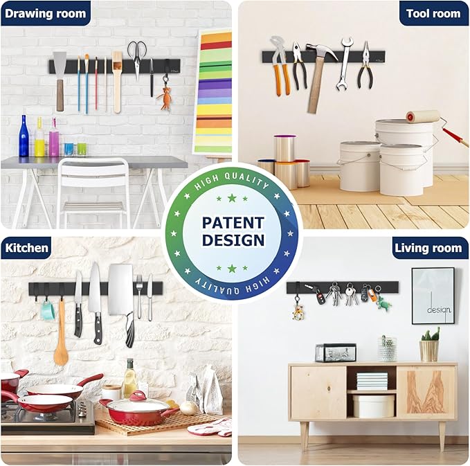 - MULTIFUNCTIONAL & 2 TYPES OF INSTALLATION: The Dmore magnetic knife rack features a hook design, allowing it to be used for both attaching and hanging. You can choose between self-adhesive tape (no drilling required) or screw installation, making it so suitable for keeping your kitchen, garage, workshop, and other spaces organized and tidy. Available in a range of sizes: 10, 12, 16, 20, and 23 inches to suit your needs.