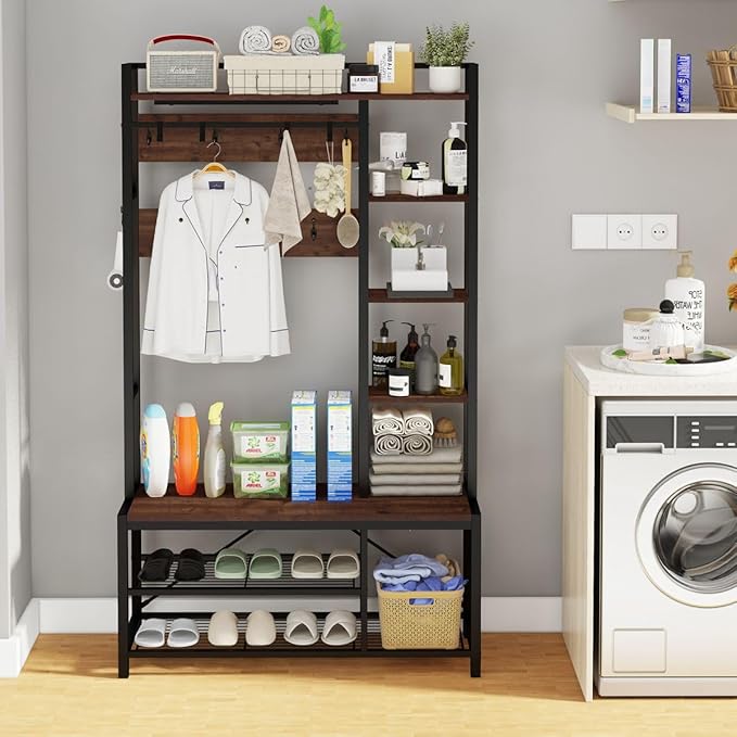 - 【5-in-1 Freestanding Hall Tree】Enhance your entryway with versatile 5-in-1 hall tree. Combining a coat rack, reversible 5 tier shelves, entryway shoe bench, 7 hanging hooks, clothes rail with 5 removable hooks, this hall tree offers both style and functionality. Keep your space impeccably organized with abundant storage for shoes, bags, coats, and more, all while adding a charming touch to your hallway.