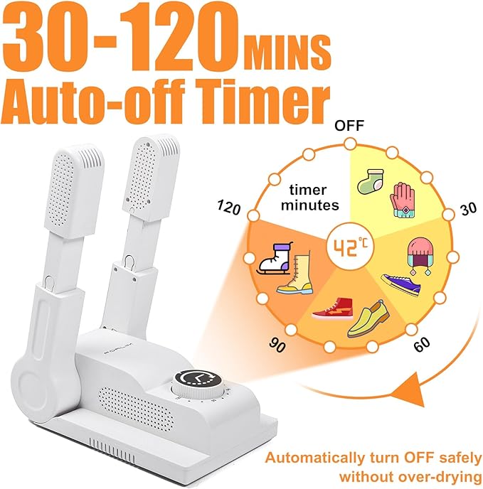 - 【Intelligent Timer】Save energy and customize your drying cycle with the 2-hour automatic shutoff timer. Set different working times for different types of shoes and reduce power consumption easily. (Note: The "42 °C" in the timer is for decorative purposes only and does not represent temperature.)