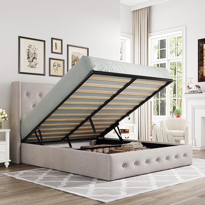 Allewie Queen Size Lift Up Storage Bed, Button Tufted Headboard with Wingback, Hydraulic Support, No Box Spring Needed, Light Beige