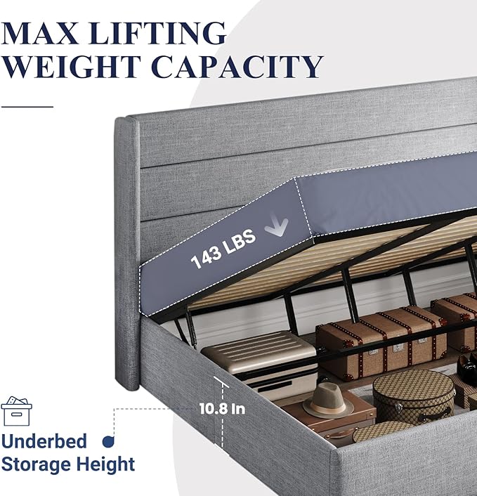- Space-Saving Storage: With its lifting up storage feature, this bed frame provides ample space to store extra bedding, clothing, shoes, and other items, especially helpful for smaller bedrooms or apartments where storage space is limited