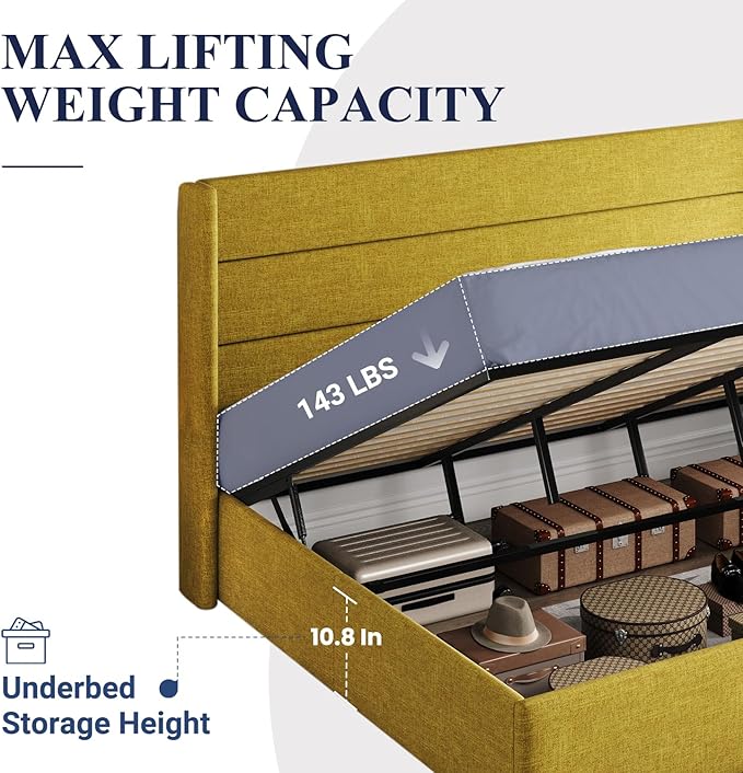 Allewie King Size Lift Up Storage Bed, Modern Wingback Headboard, Hydraulic Support, No Box Spring Needed, Olive Yellow