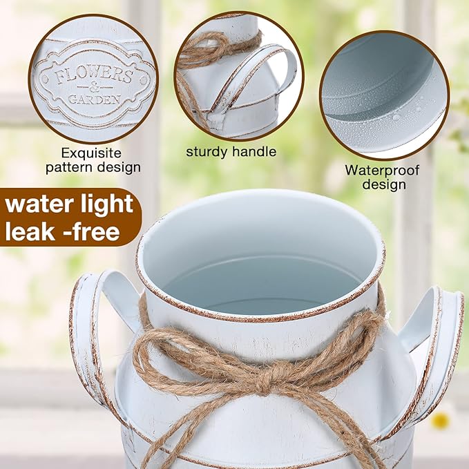 6 Inch Farmhouse Vase Decor Milk Can Vintage Flower Jug Galvanized Metal Vase with Handle Rustic Flower Buckets for Thanksgiving Christmas Table Centerpiece Weddings Gifts(Retro White,4 Pcs)