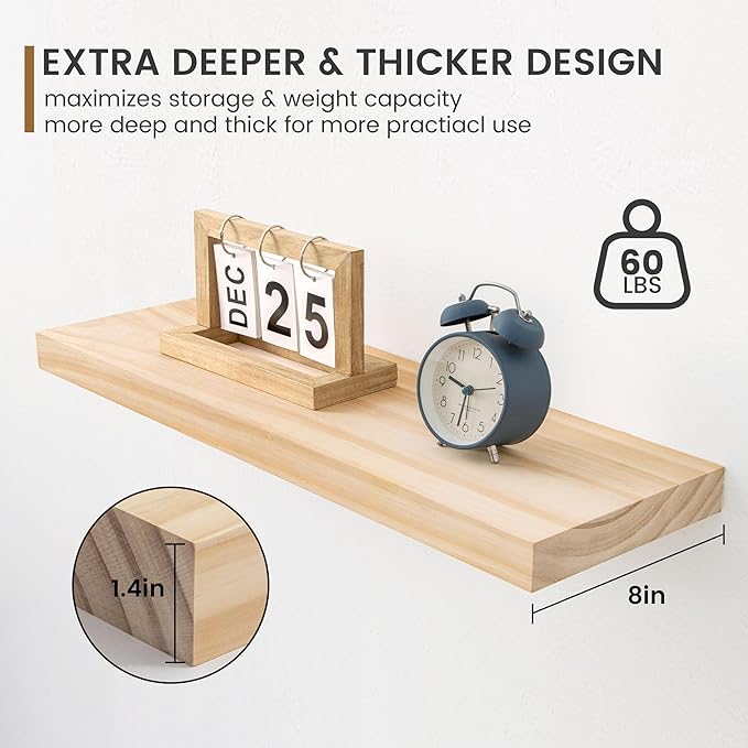 - Extra Deeper & Thicker for Storage - Each board measures 24"W x 8"D x 1.4"H. Extra deeper and thicker design in order to bring maximizes storage space and weight capacity, even hold up to 60 lb. This floating shelf taking up zero square feet, reduces clutter and highlights dΓ©cor in compact spaces. It can help make full use of the empty wall, making it much more space-saving and making your room look larger and tidier.