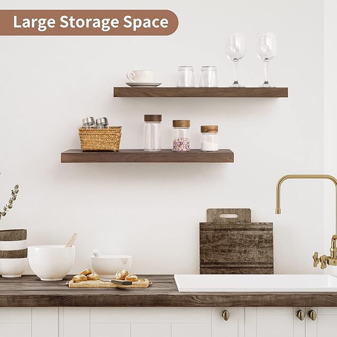 Axeman Floating Shelves for Wall, 24''W x 8'' D Rustic Solid Elm Wood Shelves for Storage, Wall Mounted Display Shelving with Invisible Heavy-Duty Metal Bracket (Walnut, 2PCs)