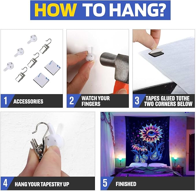 - š Brighten Up Your Space: ADDWel blacklight tapestry adds a vibrant and glowing touch to any room. ADDWel tapestry is printed with a UV-reactive ink that creates a neon-like effect under blacklight. Perfect for parties, raves, and other events that require a fun and unique atmosphere.