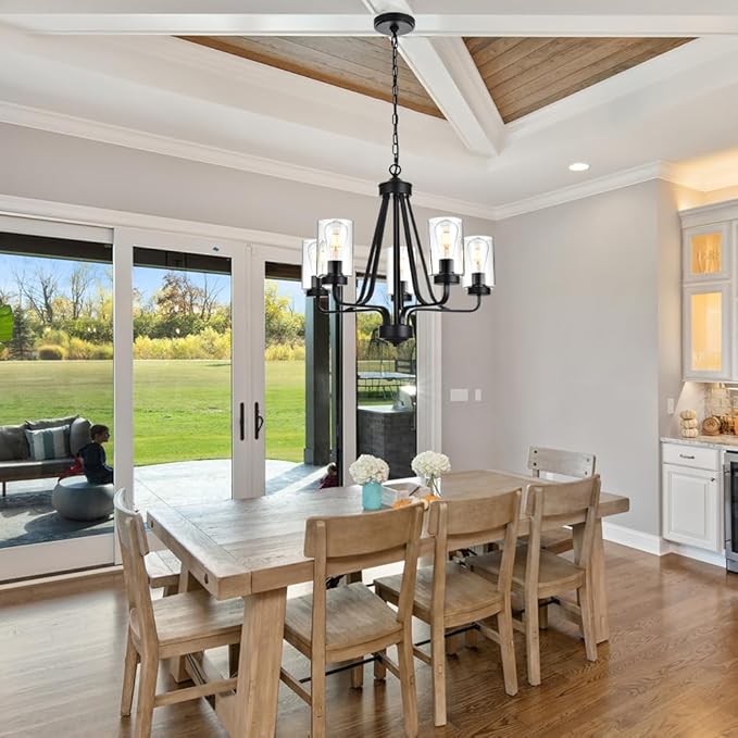 5-Lights Modern Chandelier with Clear Glass Shades, Black Farmhouse Pendant Lighting for Dining Room Kitchen Island Ceiling Light Fixture Haning Over Table