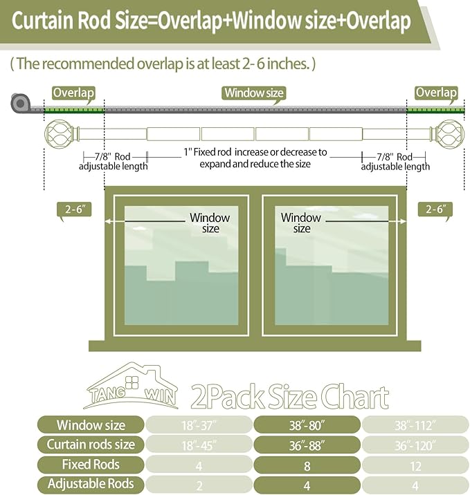 - 2 Pack Curtain Rods for Windows 48 to 84 inch(4-7ft): TANGWIN drapery rods include 8 x 16" x 1" fixed rods, 4 x 16" x 7/8" adjustable rods, 4 x finial, 6 x bracket, 6 x connector, 12 x anchor, 12 x screw. 2 Pack gold curtain rods for windows can extend from 36 to 88 inches, choose the right size curtain rods according to the length of your window.