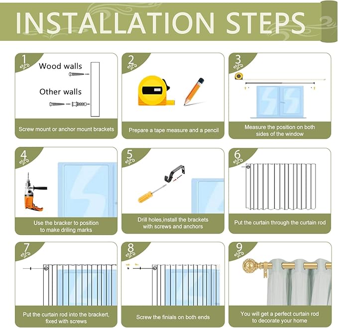 - 2 Pack Easy to Install Curtain Rods: TANGWIN provide detailed illustrated size instructions and modern decorative window curtains rod shipping package has detailed installation instructions inside, follow the steps, 2 pack gold curtain rods can easily complete the installation.