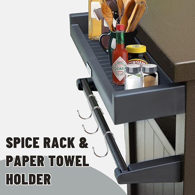 - HUMANITY DESIGN: Includes two side bars for paper towel or hook holder without hook hangers, spice rack, Lockable storage space. Place as more tools as you want.