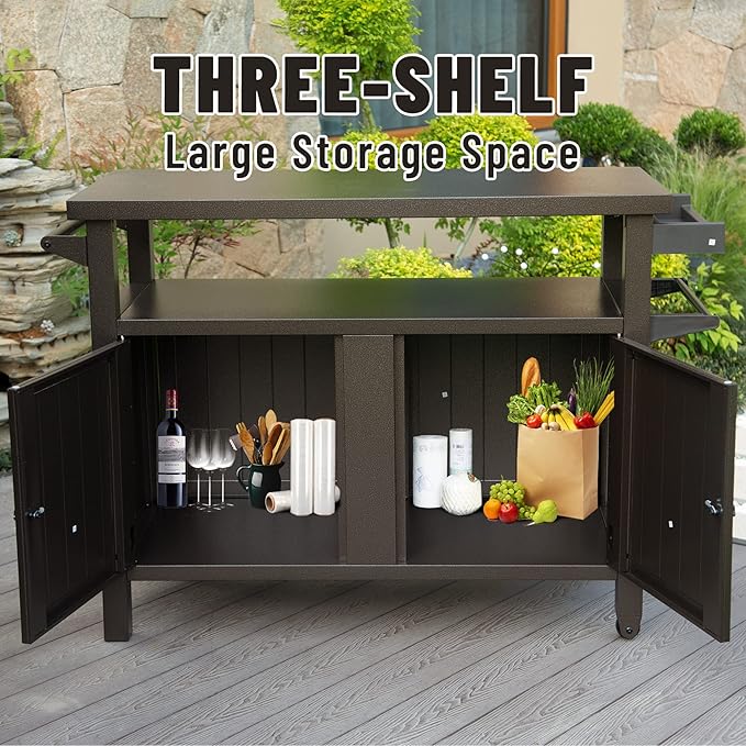 Domi Grill Carts Outdoor with Storage and Wheels, Whole Metal Portable Table and Storage Cabinet for BBQ,Deck,Patio,Backyard (Brown, L45xW20.31xH35.51 Inch)