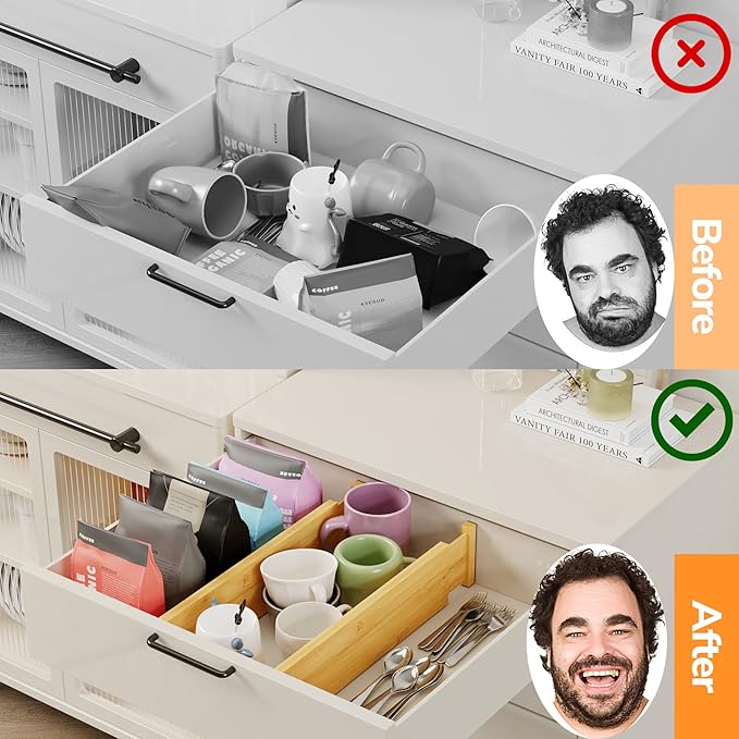 BAMEOS 4" High Drawer Dividers Bamboo Separators Organization Expandable Organizers for Kitchen Bedroom Bathroom Dresser Office 4-pack