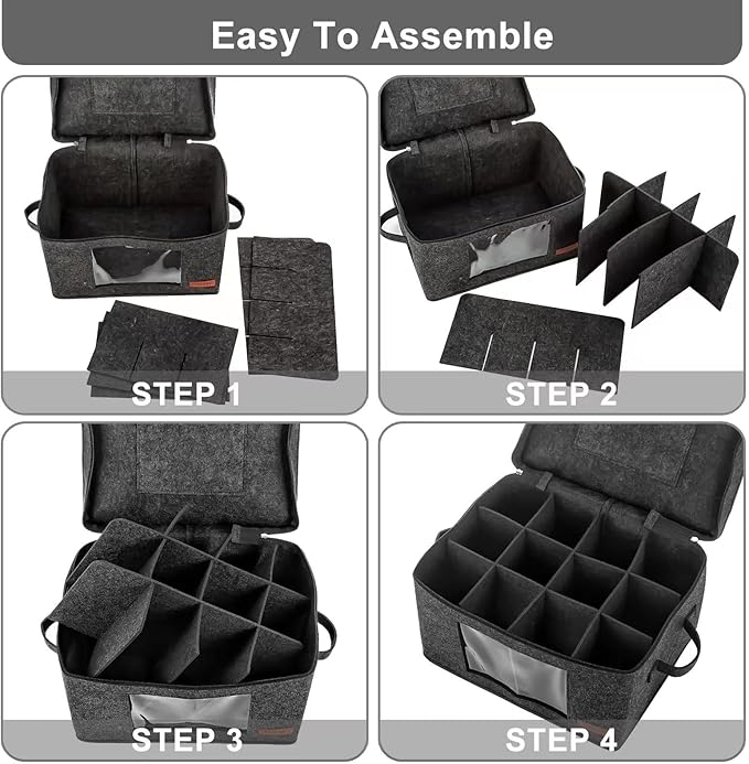 - Easy to Install: These storage container with dividers are collapsible and dismantle, It is easy to install, just assemble the dividers first, then put the into the box, finally completed. At the top of the wine glass storage containers, there is a place where we are preparing for you.