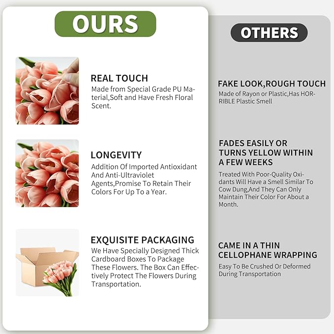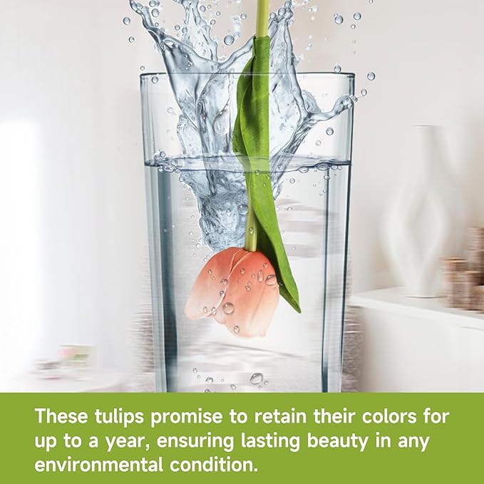 - What sets our tulips apart is their longevity. With the addition of imported antioxidant and anti-ultraviolet agents, these tulips promise to retain their colors for up to a year, ensuring lasting beauty in any environmental condition. Note: Artificial flowers without UV inhibitors will turn yellow within 2 weeks under sunlight, and those treated with poor-quality oxidants will have a smell similar to cow dung or burning plastic , and they can only maintain their color for about a month.