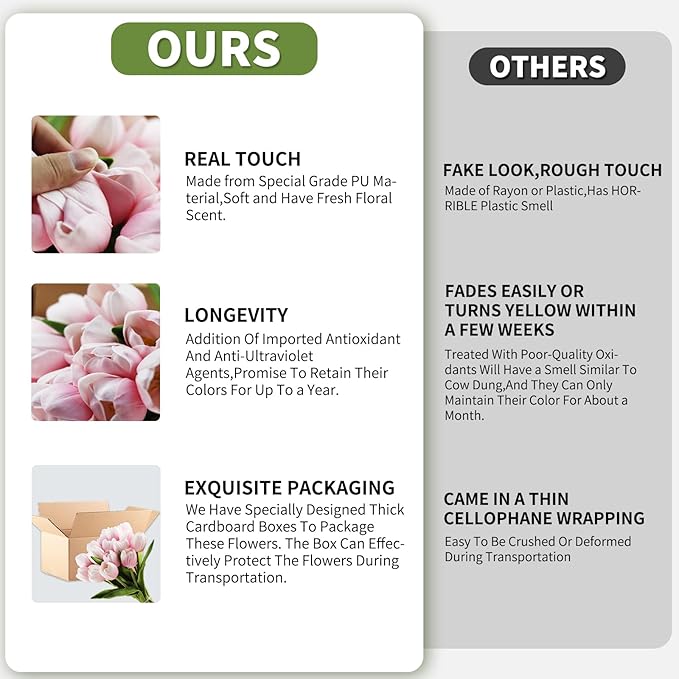 - High-Quality PU Material:Our artificial tulips are made of high-quality PU material,providing a soft touch just like real flowers,the realism is impressive. Completely eliminating the issue of plastic or chemical smells,making the flowers more environmentally friendly and harmless to the human body.