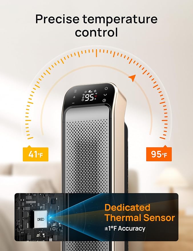 - Precise Temperature Control: Set room temperature with more accuracy than ever before, this space heater with thermostat uses a dedicated thermal sensor to gauge the room temp and adjust heating automatically in ECO Mode, temperature can be set between 41-95°F with 1°F precision for ideal comfort.