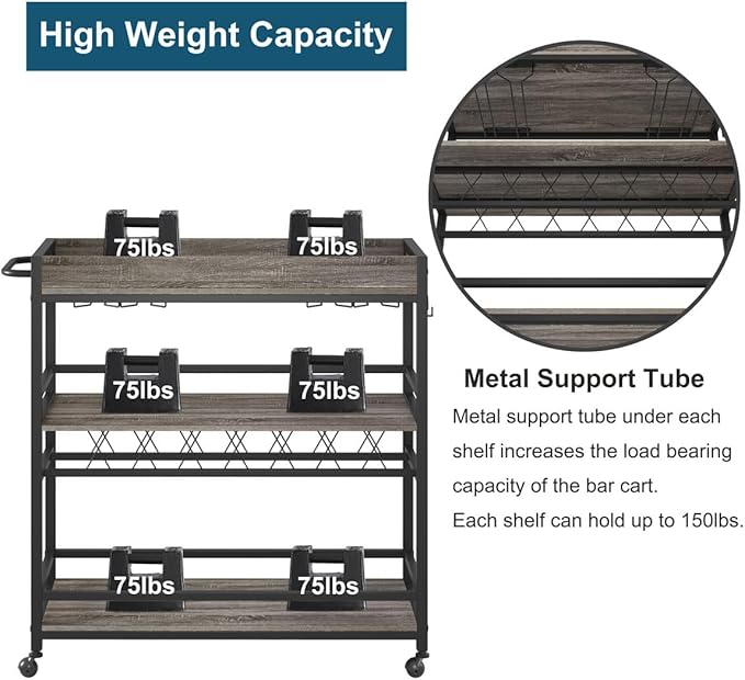 - Enhanced Stability and Convenience: To enhance this liquor cartβs weight capacity and durability, we have added two metal support rods under each shelf. Each shelf can easily hold up to 150 lbs. Additionally, the cart features 3 hanging hooks on the side, providing a convenient way to hang your towel, bar accessories, and more.