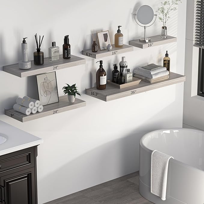 - Rustic & Modern Wooden Floating Shelves - Our shelf is made of durable engineered wood with a natural wood grain finish for a rustic feel. Matte surface makes it modern and minimalist look. It can be mounted and decorated on every wall of your home, perfect for various scenes, whether display your collection or storage.