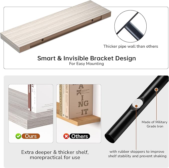 - Extra Deeper & Thicker - This wall shelf measures 36"W x 10.23"D x 1.8"H. Extra deeper and thicker design in order to bring maximizes storage space and weight capacity, even hold up to 70 lb. This floating shelf taking up zero square feet, reduces clutter and highlights dΓ©cor in compact spaces.