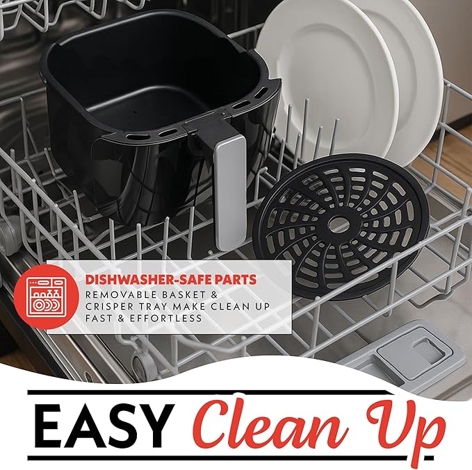 - Effortless Cleanup – Includes a nonstick, dishwasher safe four quart basket and crisper tray—no scrubbing or soaking required